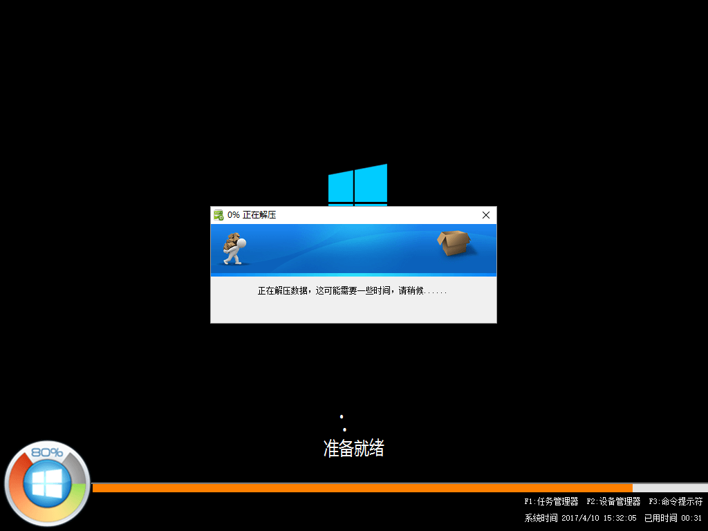 5)接下来会出现一个正在解压GHO的窗口,该窗口有进度条,此时我们无需做任何操作,只需耐心等待其完成即可,如下图所示:
