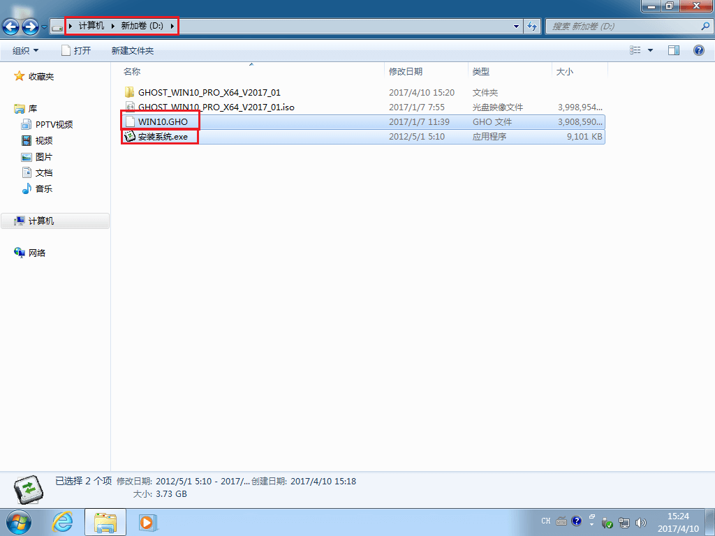 2、把“WIN10.GHO”和“GHO镜像安装器(安装系统或硬盘安装)”两个文件剪切到磁盘根目录下,这里选择放在D盘里;