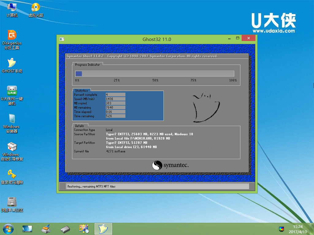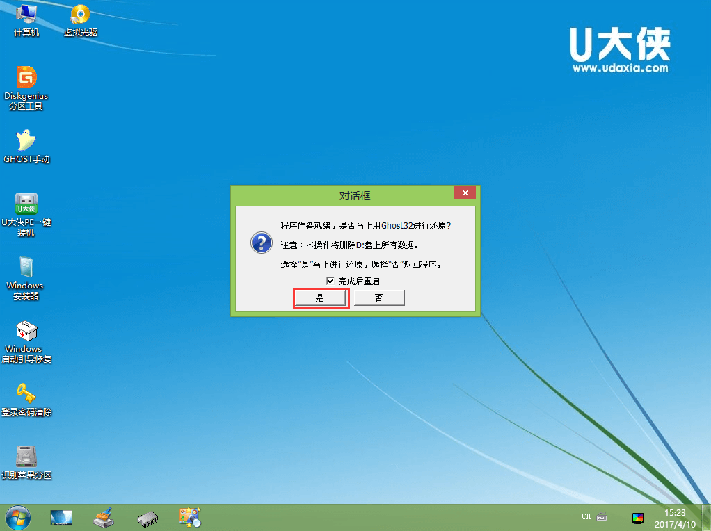 第三步:进入U大侠Win8PE系统后运行"U大侠PE一键装机"工具,安装GhostWin10系统!