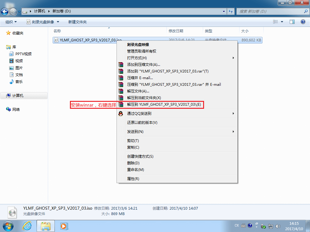 1、首先下载Ghost Winxp系统镜像“YLMF_GHOST_XP_SP3_ V2017_03.iso”到本地硬盘上(这里下载在D盘上),下载完用右键解压到YLMF_GHOST_XP_SP3_ V2017_03(建议用winrar);