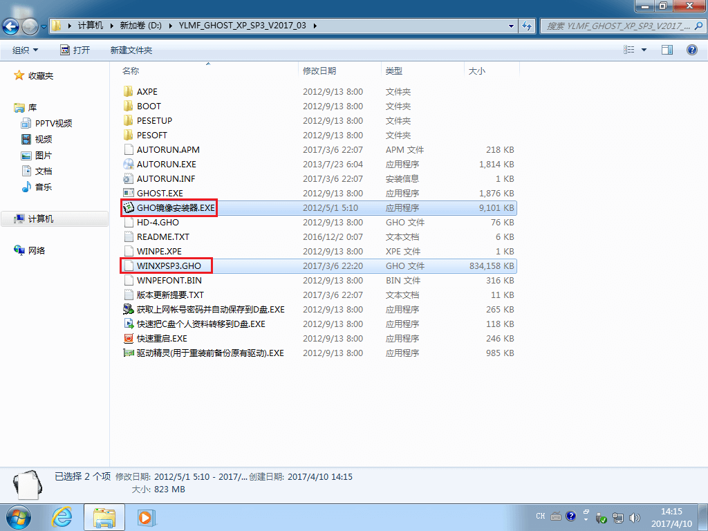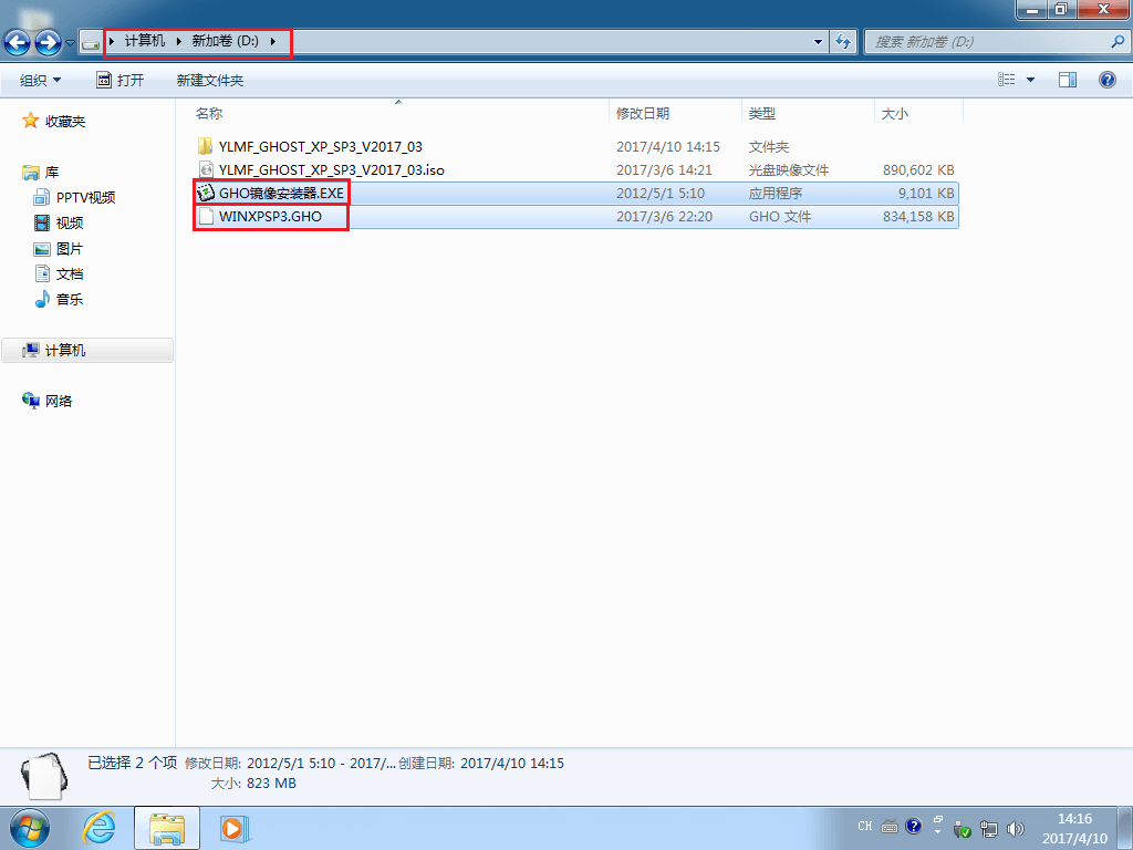 2、把“WINXPSP3.GHO”和“GHO镜像安装器(安装系统或硬盘安装)”两个文件剪切到磁盘根目录下,这里选择放在D盘里;