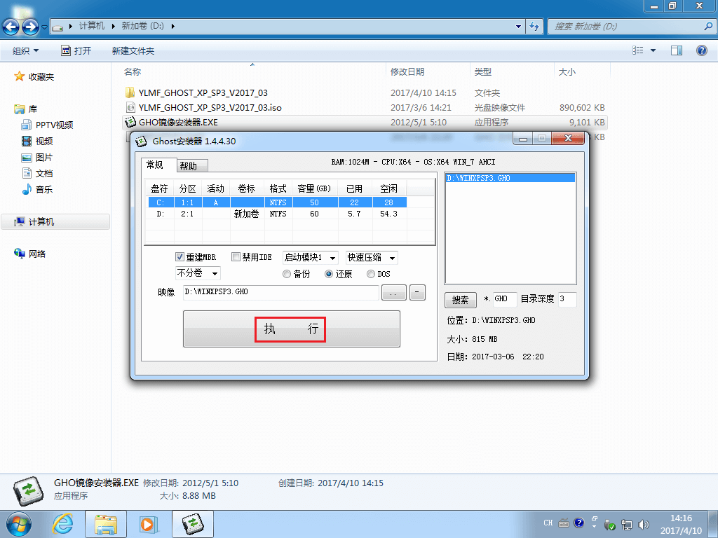 3、双击“GHO镜像安装器”,选择“C盘”(C盘为系统磁盘),插入映像文件WINXPSP3.GHO,接着点击执行,如图所示: