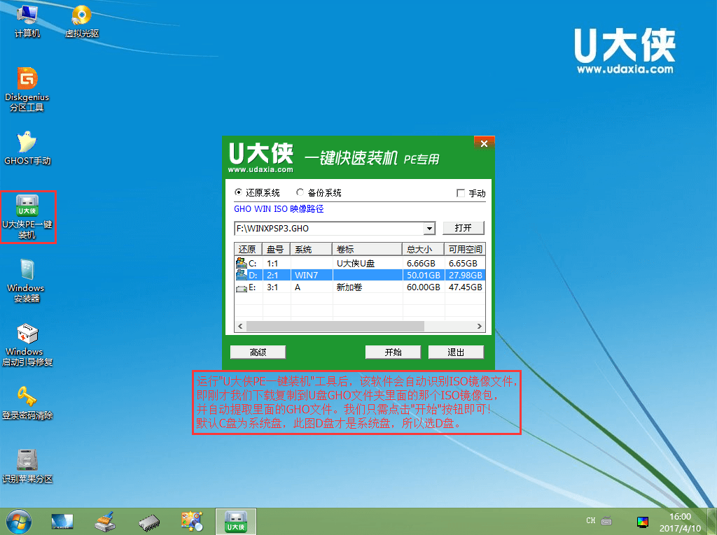 3)运行"U大侠PE一键装机"工具后,该软件会自动识别ISO镜像文件(即刚才我们下载复制到U盘GHO文件夹里面的那个ISO镜像包),并自动提取里面的GHO文件。我们只需点击"开始"按钮即可!(默认C盘为系统盘,因下图D盘才是系统盘,所以选D盘。)如下图所示: