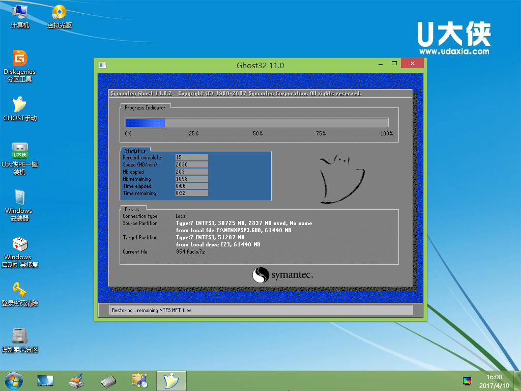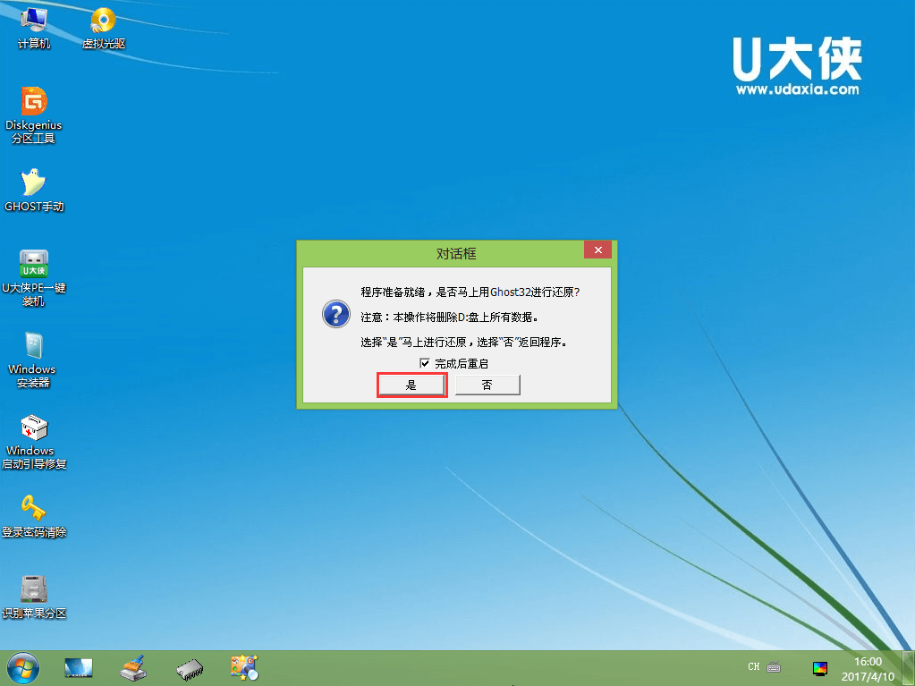 第三步:进入U大侠Win8PE系统后运行"U大侠PE一键装机"工具,安装GhostWinXP系统!