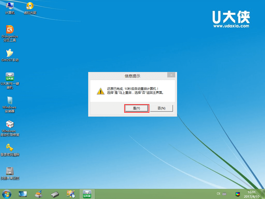 4)当点击"开始"按钮后会弹出一个小窗口,我们只需继续点击该弹出窗口的"是"按钮即可,如下图: